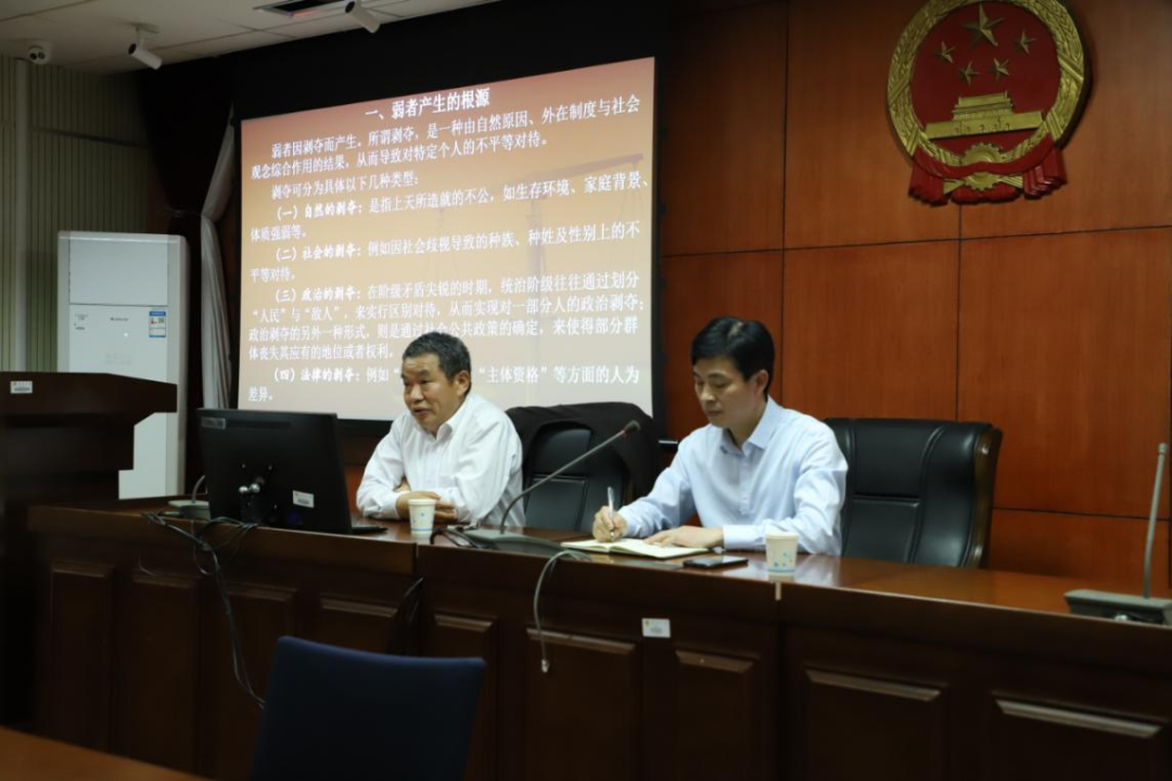 2021年4月26日晚上,教育部長(zhǎng)江學(xué)者特聘教授、華東政法大學(xué)博士生導(dǎo)師胡玉鴻應(yīng)邀來(lái)到東南大學(xué)人權(quán)研究院,以“弱者及其權(quán)益保護(hù)”為題,在法學(xué)院四樓模擬法庭舉行講座。本次講座由東南大學(xué)人權(quán)研究院常務(wù)副院長(zhǎng)龔向和教授主持,法學(xué)院師生共同參加了這次講座。