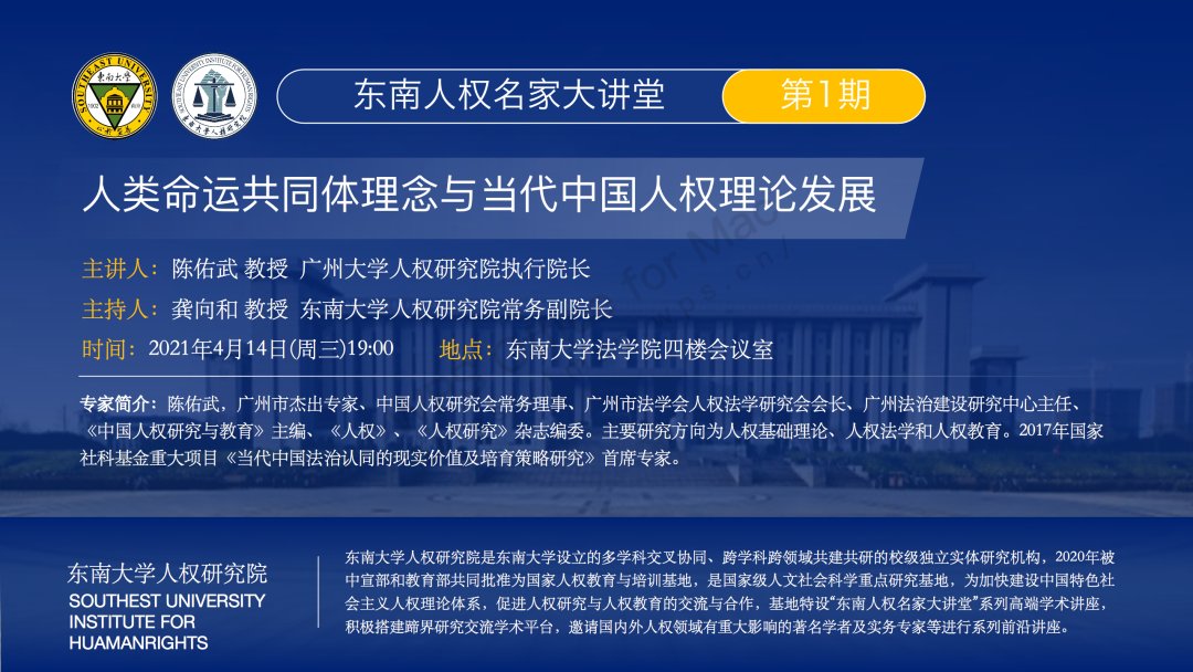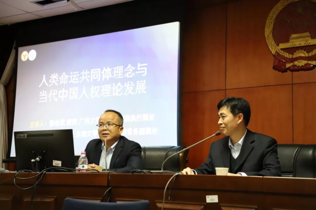 2021年4月14日晚上,廣州大學(xué)人權(quán)研究院執(zhí)行院長(zhǎng)陳佑武教授應(yīng)邀來到東南大學(xué)人權(quán)研究院,以“人類命運(yùn)共同體理念與當(dāng)代中國(guó)人權(quán)理論發(fā)展”為題,在法學(xué)院四樓模擬法庭舉行講座。本次講座由東南大學(xué)人權(quán)研究院常務(wù)副院長(zhǎng)龔向和教授主持,劉練軍教授、張雪蓮老師以及法學(xué)院研究生共同參加了這次講座。