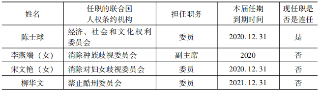 表3 2020年中國專家在國際人權條約機構的任職情況