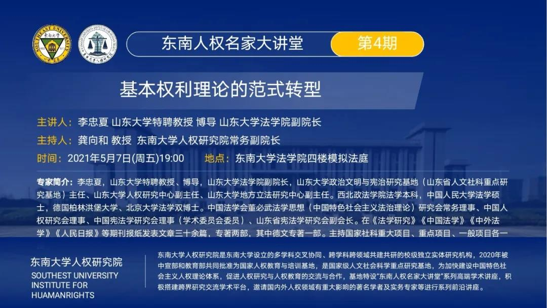 2021年5月7日,山東大學(xué)特聘教授、博士生導(dǎo)師、山東大學(xué)法學(xué)院副院長(zhǎng)李忠夏應(yīng)邀來(lái)到東南大學(xué)人權(quán)研究院,以“基本權(quán)利理論的范式轉(zhuǎn)型”為題,在法學(xué)院四樓模擬法庭舉行講座。本次講座由東南大學(xué)人權(quán)研究院常務(wù)副院長(zhǎng)龔向和教授主持,法學(xué)院師生共同參加了這次講座。