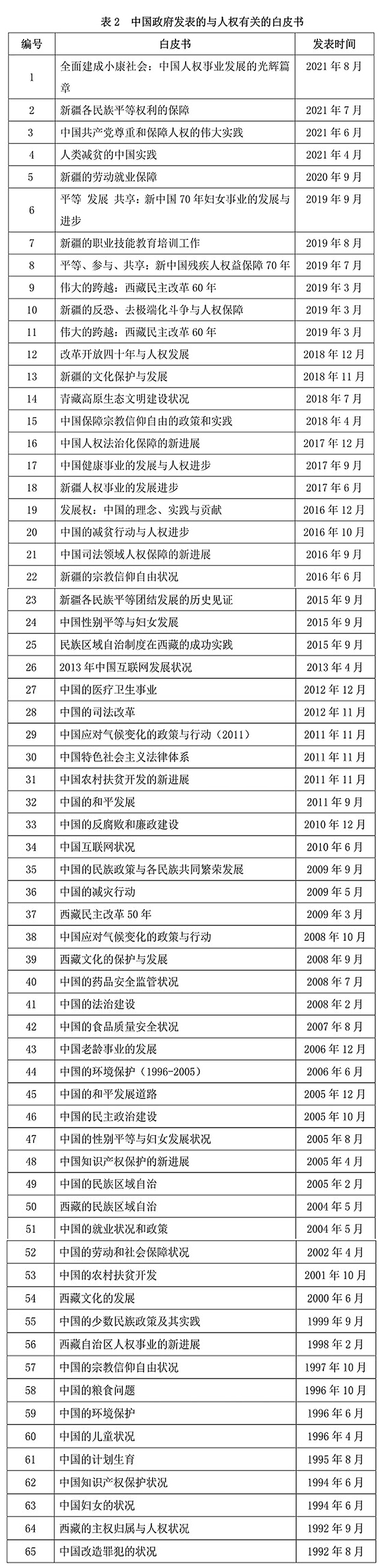 中國政府還不定期發(fā)表與人權有關的各種白皮書,主要涉及改革開放、小康社會建設、扶貧開發(fā)、減災行動、醫(yī)療衛(wèi)生、食品藥品安全、知識產(chǎn)權保護和環(huán)境保護,互聯(lián)網(wǎng)建設、宗教信仰自由和計劃生育,反腐敗、司法改革、法治建設和民主政治建設,婦女、兒童、老年人、少數(shù)民族和在押罪犯權利保護,以及和平發(fā)展等主題。自1992年至2021年9月,共發(fā)布約65部與人權有關的白皮書。(見表2)