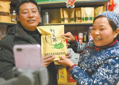 1月7日,安徽六安金寨縣花石鄉(xiāng)大灣村脫貧戶楊習(xí)倫(左)、肖細(xì)雨夫婦在直播銷售山區(qū)土特產(chǎn)。 人民視覺