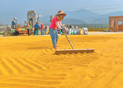 9月14日,山西運(yùn)城垣曲縣運(yùn)通種植專業(yè)合作社的員工在晾曬谷子。新華社發(fā)