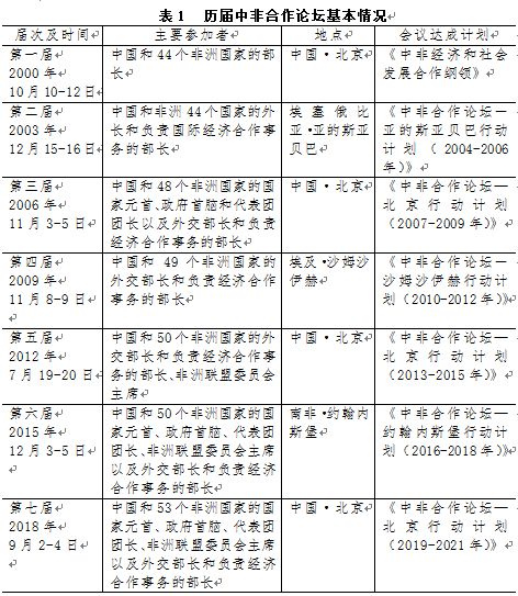 中非合作有著悠久的歷史。1949年新中國成立后,在國家百廢待興、財力緊張的情況下,中國就開始向非洲國家提供各種援助,為非洲國家爭取民族獨立和解放,促進經(jīng)濟社會發(fā)展提供有力支持。1978年中國開始改革開放后,中非雙方更加重視經(jīng)貿往來和平等互利的發(fā)展合作。2000年雙方建立“中非合作論壇”機制,至今已經(jīng)成功舉辦了七屆,每一屆論壇都在諸多領域制定了目標明確的行動計劃。這些會議的時間及主要參與者、會議達成的計劃文件的名稱見表1。
