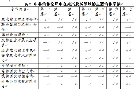 減貧脫貧涉及多種權利的保障,其中最為核心的是基本生活水準權利,包括水權、食物權、住房權等,還與一系列其他權利息息相關,比如,受教育權、文化權、發(fā)展權、健康權等。這些權利得到起碼水平的保障是確保“人之為人”“享有作為人的尊嚴”的基礎。從中非雙方的合作內容來看,主要舉措如下:(1)通過農(nóng)業(yè)領域的合作,提高農(nóng)業(yè)生產(chǎn)率,增加糧食產(chǎn)量,保障糧食安全,從而確保非洲國家民眾的食物權,具體形式包括援建農(nóng)業(yè)技術示范中心、派遣農(nóng)業(yè)技術專家、援建農(nóng)場等;(2)通過教育培訓、經(jīng)驗分享、援建職業(yè)技術培訓設施等,提高非洲國家貧困人口的致富能力,促進人們教育權和文化權利的實現(xiàn);(3)改善非洲國家在交通、通信、水利、電力、能源等方面的基礎設施,為他們擺脫貧困提供基礎條件;(4)加強產(chǎn)業(yè)合作和經(jīng)貿往來,尤其是促進非洲勞動密集型產(chǎn)業(yè)發(fā)展,為民眾創(chuàng)造更多的就業(yè)機會。這些相關舉措及在歷屆中非論壇中的分布情況參見表2。