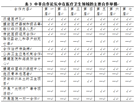 醫(yī)療衛(wèi)生涉及健康權和生命權的保障,是關系一個國家民眾人權保障水平的重要內容。除了大面積的貧困和饑餓之外,缺醫(yī)少藥是另外一個威脅非洲國家民眾基本人權的嚴峻挑戰(zhàn),艾滋病、瘧疾、肺結核等傳染病的肆虐給他們帶來難以消除的持久傷害。從歷史上來看,醫(yī)療衛(wèi)生一直是中國援助非洲最重要的領域之一。早在20世紀60年代,中國就應邀組建醫(yī)療隊進行對非援助,此后醫(yī)療援助從未中斷。2000年中非合作論壇成立后,中非醫(yī)療衛(wèi)生合作進入機制化軌道,逐漸形成了系統(tǒng)化、立體化的醫(yī)療援助體系。截至2019年,中國累計向非洲國家派出醫(yī)療隊員約2.5萬名,救治了2.7億名非洲患者,援建了30個抗瘧中心,為非洲國家培養(yǎng)了數(shù)萬名本土醫(yī)護人員和醫(yī)療骨干力量,還將針灸、推拿等中華傳統(tǒng)醫(yī)療技術傳入非洲。表3列舉了本領域的主要合作舉措。