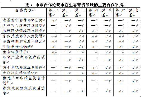 綜合表4及歷屆論壇發(fā)布的行動計劃來看:(1)環(huán)境保護在中非合作框架內的重要性逐漸增強,表現(xiàn)為在第一屆中設立了“環(huán)境管理和生物多樣性”部分,在第二屆中沒有設立單獨部分,從第三屆開始,環(huán)境保護內容作為單獨部分設立并得到延續(xù)。(2)環(huán)境保護的“務實性”和“積極性”逐步增強,表現(xiàn)為相對于前期中非合作論壇側重“原則性”“消極性”的表述而言,后續(xù)論壇的“務實性”“積極性”顯著增加,各類項目也更加具體。(3)雙方環(huán)境保護合作的側重點隨著社會需求變化而變化,比如,第一屆強調“環(huán)境管理與國家發(fā)展相結合”,后續(xù)的第四、五、六屆則強調“應對氣候變化”“如何減災救災”等。