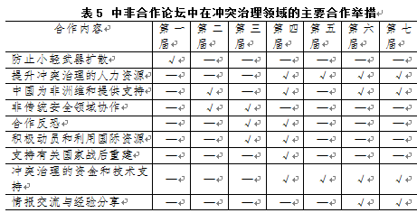 從表5以及歷屆論壇的具體內容來看,中非在沖突治理領域的合作具有如下幾個特點:(1)沖突治理的主要內容既包括傳統(tǒng)安全也包括非傳統(tǒng)安全,非傳統(tǒng)安全主要表現(xiàn)為恐怖主義、小武器走私等。(2)在合作模式上,強調通過支持和加強已有機制的能力來發(fā)揮沖突的預防、化解、轉化以及沖突后重建的功能,比如通過聯(lián)合國、非洲聯(lián)盟以及非洲其他次區(qū)域組織發(fā)揮作用,而不是作為獨立主體直接介入沖突中。(3)隨著雙方?jīng)_突治理合作的深入,中方為非洲國家提供資金、技術和賦能性培訓逐漸成為常規(guī)合作方式。