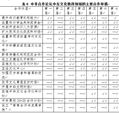 從表6以及歷屆中非合作論壇的具體內容來看,中非在文化教育領域的合作呈現(xiàn)出如下特點:(1)隨著時間的推移和合作的深入,文化教育領域的舉措總體上不斷增多,不僅傳統(tǒng)的舉措得到延續(xù),而且不斷推出新的舉措,由于文化教育交流內容的廣泛性、交流主體的多元性、交流形式的多樣性,文化教育交流日益呈現(xiàn)出多元、互動、繁榮的趨勢。(2)文化教育交流合作呈現(xiàn)出機制化、具體化、實體化的趨向,比如“中非高校20+20合作計劃”“中非智庫10+10伙伴合作計劃”等,以及設立“南南合作與發(fā)展學院”“文化中心”“孔子學院”等,這些舉措務實具體,表明中非雙方不僅有文化交流的意愿,而且越來越將這種交流通過具體的機制和載體來加以持續(xù)化地推進。