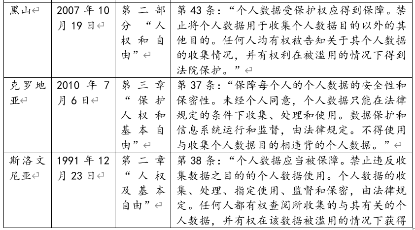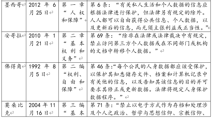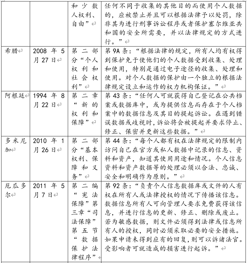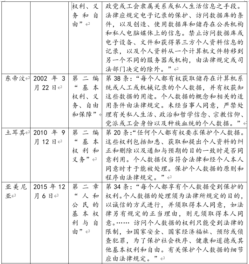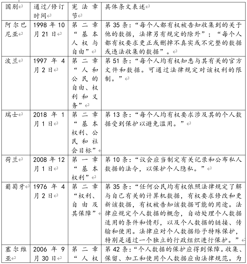 表1:域外憲法關于個人數(shù)據受保護權的主要規(guī)定