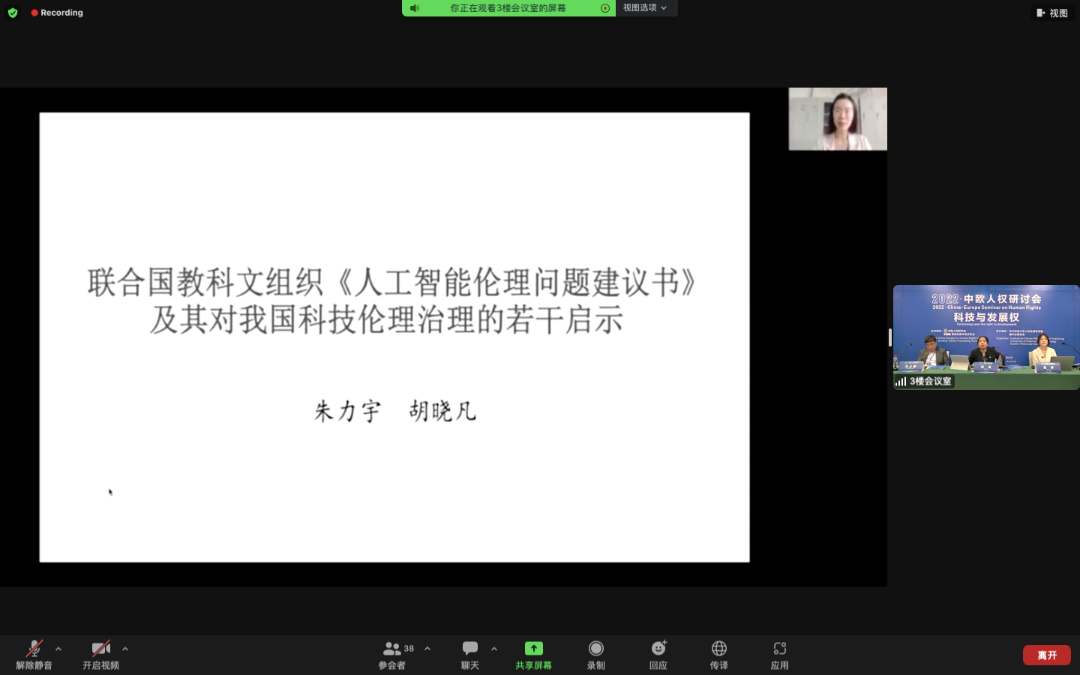 中國(guó)政法大學(xué)外國(guó)語學(xué)院講師胡曉凡在會(huì)上作題為《聯(lián)合國(guó)教科文組織<人工智能倫理問題建議書>及其對(duì)我國(guó)科技倫理治理的若干啟示》的發(fā)言。