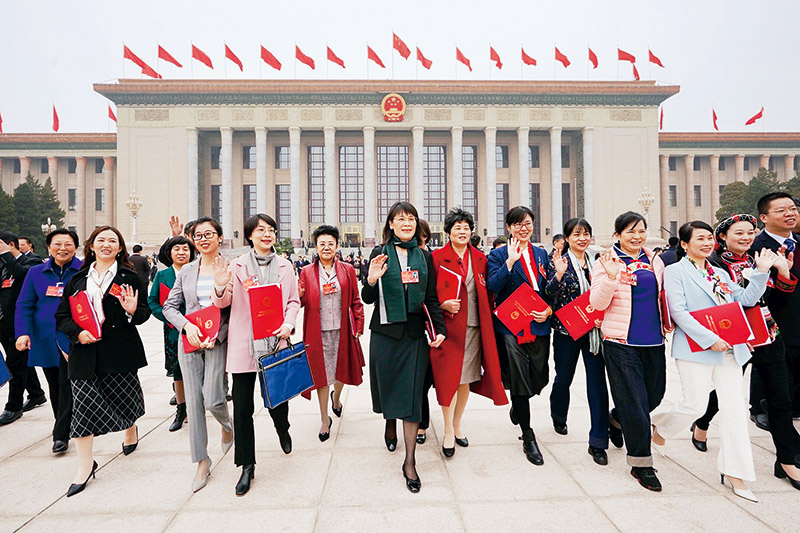 黨的十八大以來,在推進(jìn)國家治理體系和治理能力現(xiàn)代化進(jìn)程中,婦女參與國家和社會事務(wù)管理的水平全面提升,在民主政治建設(shè)中的作用日益增強(qiáng)。作為我國政治生活中的一件大事,全國兩會上的女性身影越來越多。人大女代表、政協(xié)女委員認(rèn)真履職盡責(zé)、建言獻(xiàn)策,充分展現(xiàn)了新時代女性風(fēng)采。圖為2022年3月11日,第十三屆全國人民代表大會第五次會議在京閉幕后,代表走出人民大會堂。 新華社記者 高潔/攝