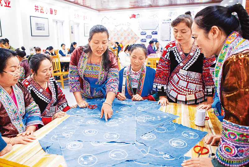 2021年11月4日,廣西融水苗族自治縣舉辦民族手工藝(苗繡)培訓(xùn)班,易地扶貧搬遷社區(qū)苗家小鎮(zhèn)40多名婦女參加培訓(xùn),為居家就業(yè)打下基礎(chǔ)。圖為授課老師在講評學(xué)員繡品。 中新社發(fā) 龍濤/攝