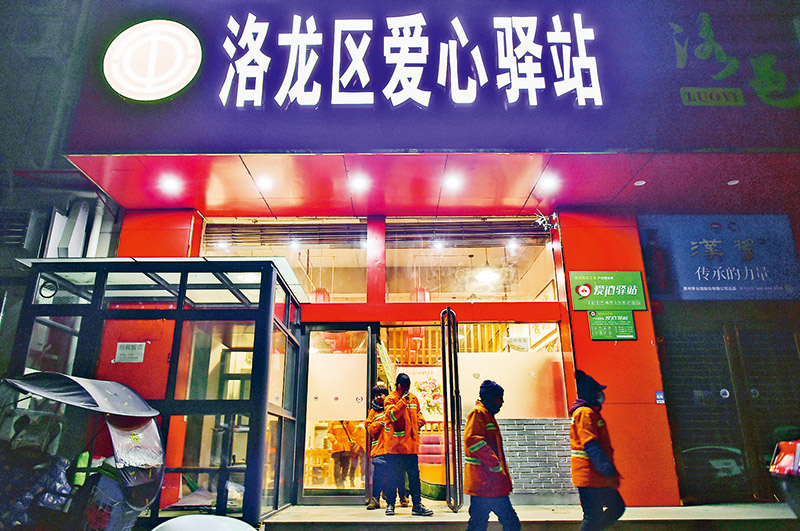 為解決環(huán)衛(wèi)工人吃早餐難問題,河南省洛陽市為早班一線環(huán)衛(wèi)工人提供免費(fèi)早餐,費(fèi)用由洛陽市各縣(市)區(qū)工會、財政和環(huán)衛(wèi)企業(yè)進(jìn)行補(bǔ)貼。圖為2021年12月19日清晨,環(huán)衛(wèi)工人在洛陽市洛龍區(qū)牡丹大道旁的“愛心驛站”用餐后離開。 新華社發(fā) 黃政偉/攝