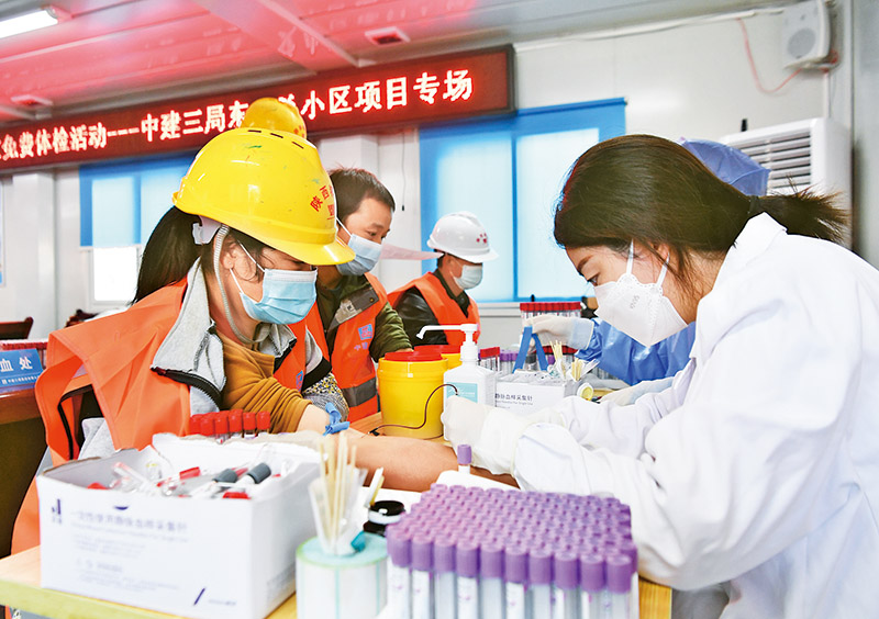 陜西省總工會開展“送體檢進(jìn)工地”萬名農(nóng)民工免費(fèi)體檢活動,組織醫(yī)務(wù)人員走進(jìn)多家建設(shè)單位,分批次為一萬余名農(nóng)民工開展健康體檢和醫(yī)療咨詢。圖為2021年11月19日,在西安市一處安置小區(qū)建設(shè)項目,工人在接受身體檢查。 新華社記者 張博文/攝