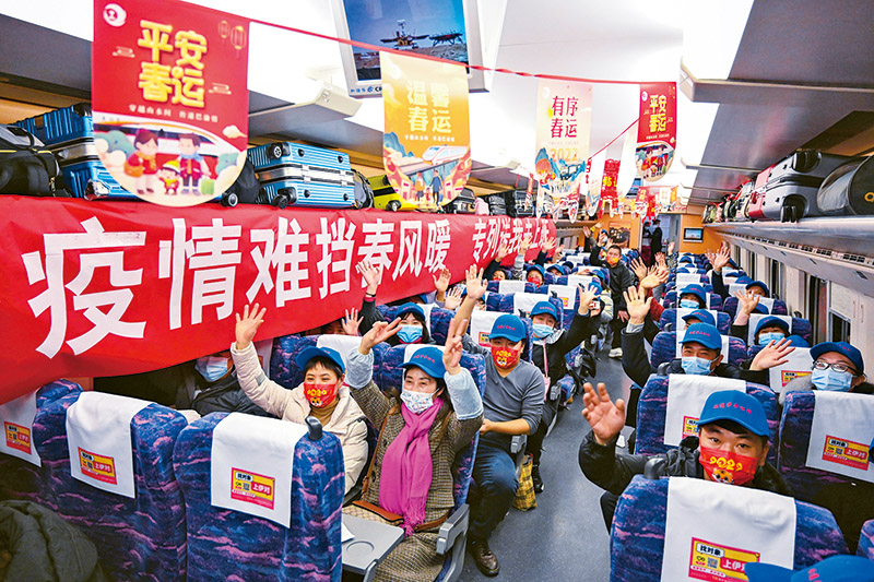 今年,要繼續(xù)做好“六穩(wěn)”、“六保”工作特別是保就業(yè)保民生保市場主體。圖為2022年2月8日,務(wù)工人員乘坐D1869次列車從貴州省遵義市前往廣東省返崗務(wù)工。該列車是貴州省今年開行的首趟返崗務(wù)工動車專列。 新華社發(fā) 包亮/攝