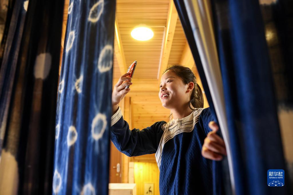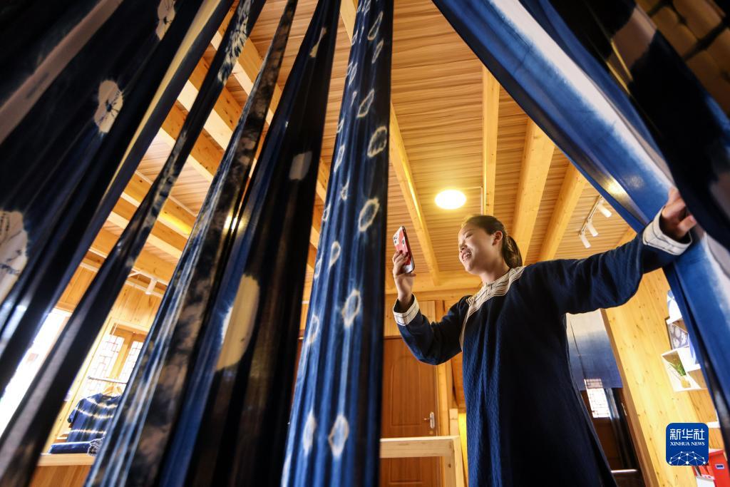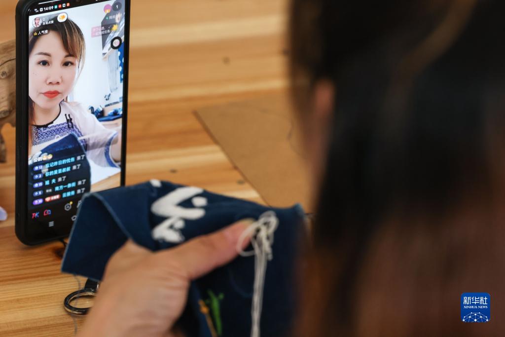 6月23日,在貴州省黔東南苗族侗族自治州榕江縣特和社區(qū)“母親回家手工坊直播中心”內(nèi),主播王洪丹通過直播推銷蠟染制品。新華社記者 歐東衢 攝