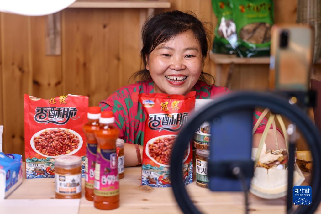 6月23日,在貴州省黔東南苗族侗族自治州榕江縣新媒體產(chǎn)業(yè)園一直播間,一名主播通過直播方式推銷當(dāng)?shù)靥禺a(chǎn)。新華社記者 歐東衢 攝