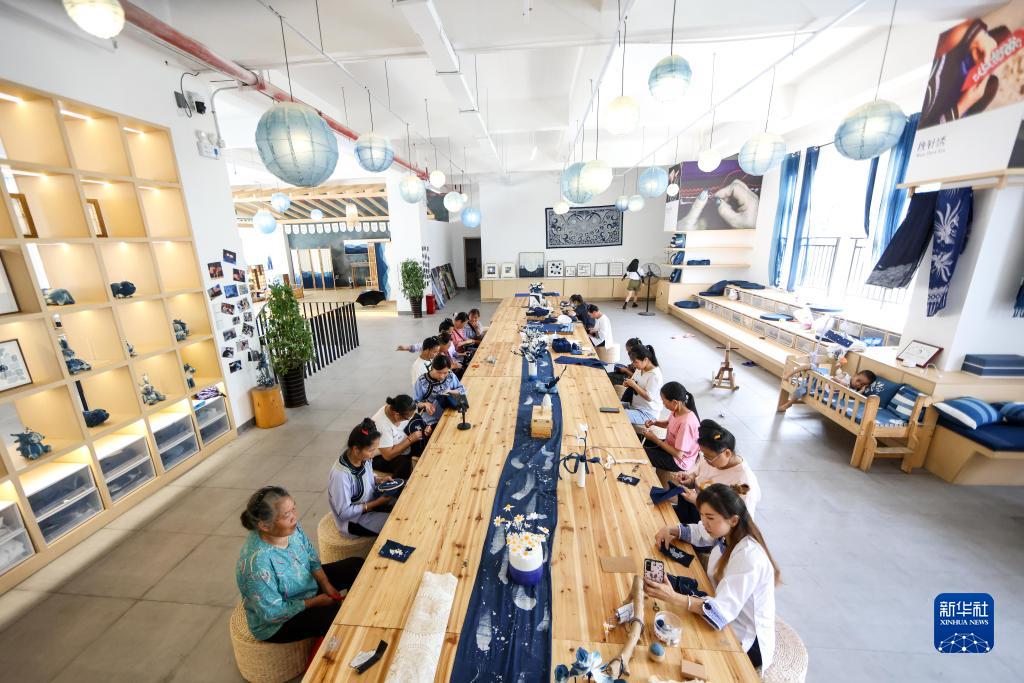 6月23日,在貴州省黔東南苗族侗族自治州榕江縣特和社區(qū)“母親回家手工坊直播中心”內(nèi),主播與當(dāng)?shù)乩C娘一起直播刺繡技藝。新華社記者 歐東衢 攝