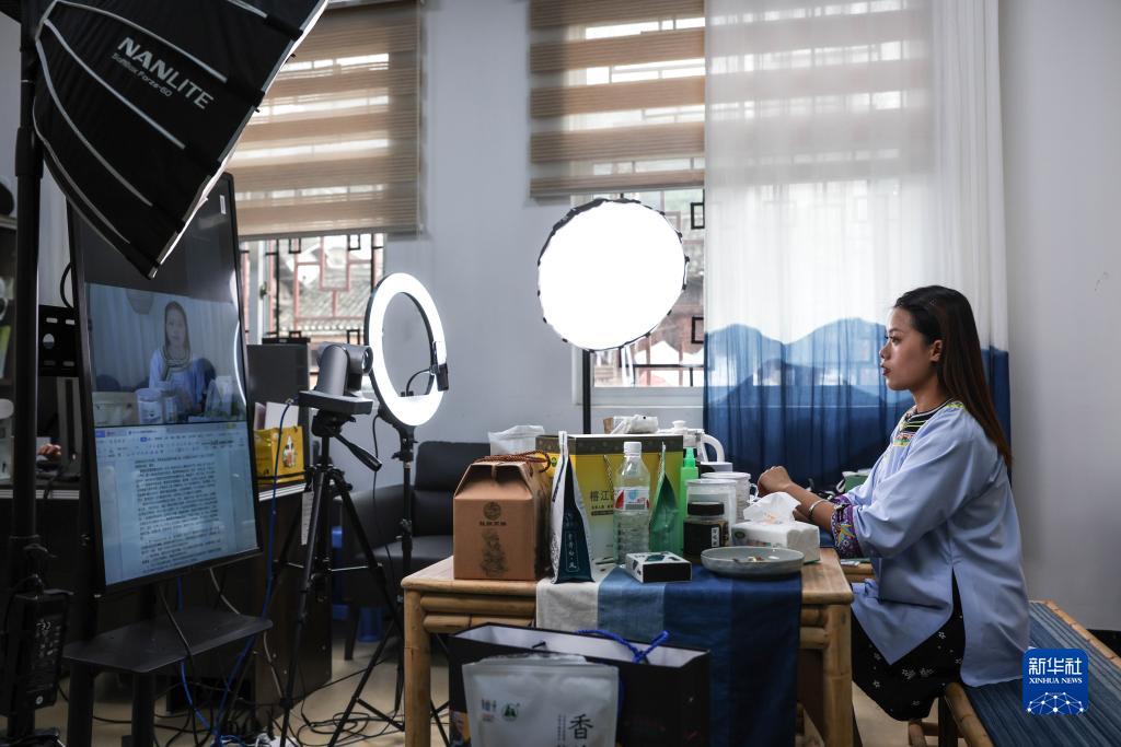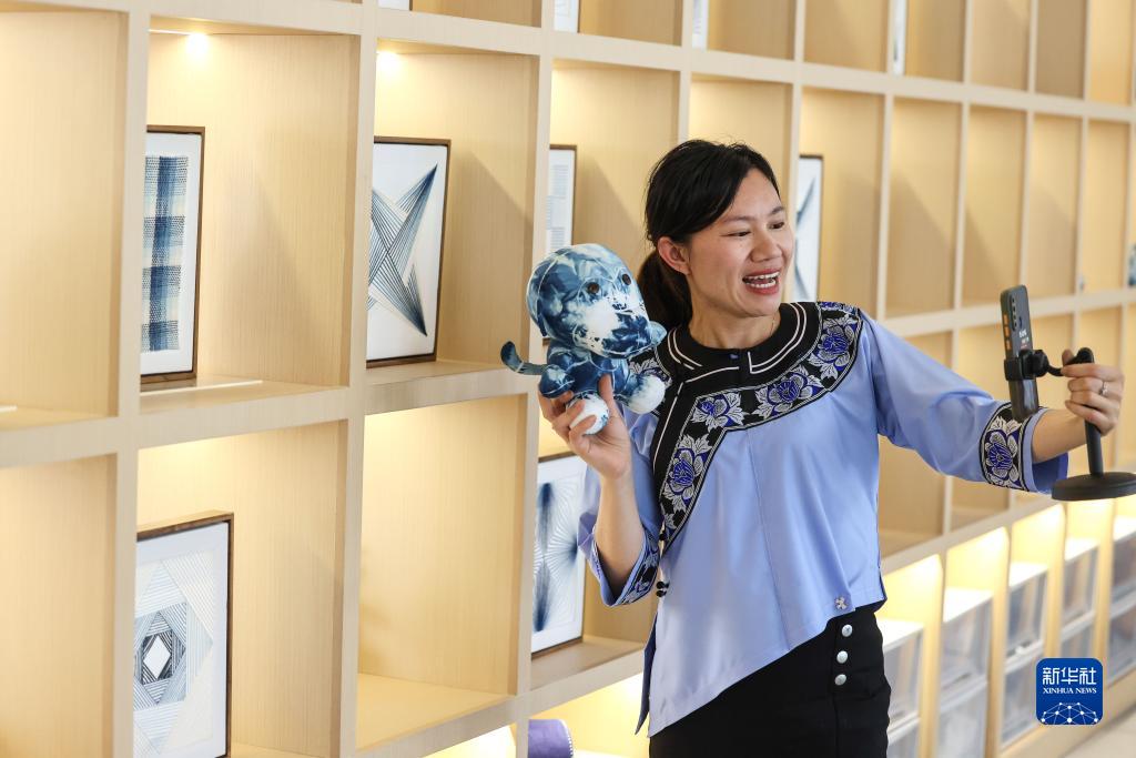 6月23日,在貴州省黔東南苗族侗族自治州榕江縣新媒體產(chǎn)業(yè)園一直播間,女主播吳家美通過直播方式推銷蠟染制品。新華社記者 歐東衢 攝