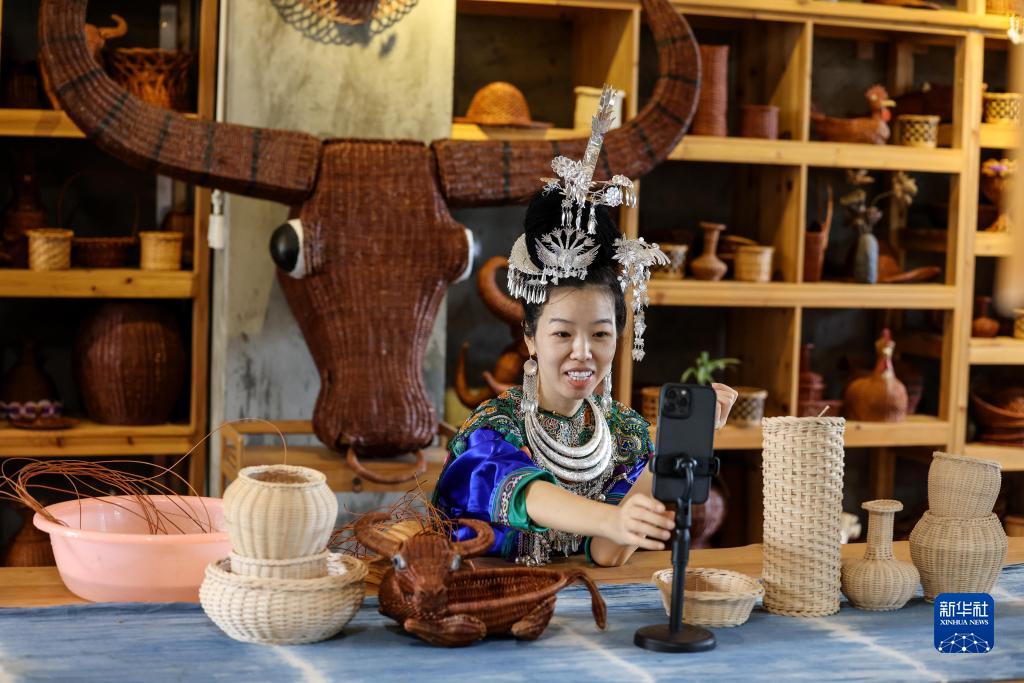6月23日,在貴州省黔東南苗族侗族自治州榕江縣一蕨編工坊,主播張珍菲在直播蕨編編織過程。新華社記者 歐東衢 攝