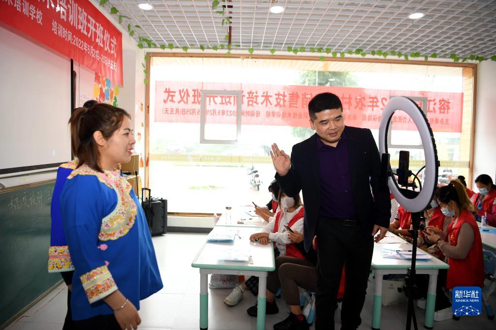 5月24日,貴州省榕江縣富民社區(qū)服務(wù)中心網(wǎng)絡(luò)直播營銷技能培訓(xùn)教室里,教師在指導(dǎo)學(xué)員進行直播實操訓(xùn)練。新華社發(fā)(王炳真 攝)
