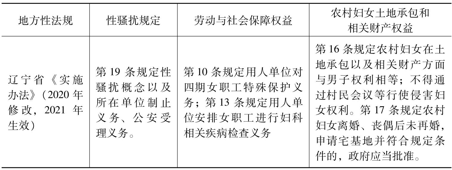 我國(guó)現(xiàn)有關(guān)于婦女權(quán)利保障的行政法規(guī)有《特別規(guī)定》等,相較《婦女法》等基本法,這些法規(guī)規(guī)章條款更為具體細(xì)致,司法適用性更強(qiáng)。同時(shí),我國(guó)地方文化經(jīng)濟(jì)等差異決定了統(tǒng)一立法難以完全照顧到不同的地方具體情況,地方可根據(jù)上位法結(jié)合本地情況制定實(shí)施辦法。地方立法一方面需要符合上位法的基本精神,在不與《婦女法》等上位法或行政法規(guī)相抵觸的前提下,將國(guó)家有關(guān)制度和規(guī)定細(xì)化為更加符合地方實(shí)際,更具有針對(duì)性、可操作性、可執(zhí)行性的條文。另一方面,各地實(shí)施辦法修訂工作應(yīng)積極吸納理論界最新研究和實(shí)務(wù)界最新探索,在立法模式、章節(jié)架構(gòu)、制度創(chuàng)新方面可以作出比統(tǒng)一法更為大膽的嘗試。但是,囿于上位法的滯后和轄制,下位規(guī)章和辦法嘗試創(chuàng)新和突破時(shí)又容易陷入整體優(yōu)化乏力的困境,一定程度上對(duì)《婦女法》修訂完善工作形成倒逼態(tài)勢(shì)。地方創(chuàng)新性立法是滿足地方發(fā)展需求,實(shí)現(xiàn)地方治理法治化的必由之路。地方為中央立法發(fā)揮先行先試、立法“試驗(yàn)田”的作用,為正式立法積累了經(jīng)驗(yàn)、創(chuàng)造了條件,有助于完善社會(huì)主義法治體系?!读⒎ǚā窞榈胤搅⒎ㄏ刃邢仍囂峁┝朔梢罁?jù)。如下表所示,近年一些地方實(shí)施辦法已經(jīng)先行進(jìn)行了修訂,新增和更新內(nèi)容主要集中在性騷擾防治、勞動(dòng)與社會(huì)保障權(quán)益、農(nóng)村婦女土地承包、其他財(cái)產(chǎn)權(quán)益等糾紛矛盾較多的四個(gè)方面。