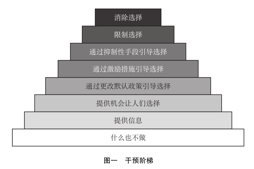 按照干預程度的強弱可將“干預階梯”中的干預措施進一步劃分為強制性、綜合性干預以及柔性干預三類。“消除選擇”為強制性措施,對個體的干預程度最為嚴重。“限制選擇”、“通過抑制性手段引導選擇”、“通過激勵措施引導選擇”以及“通過更改默認政策引導選擇”可歸入綜合性措施。這類措施的特點在于并不直接對個人行為加以干預,而是通過改變外圍因素對個體行為產(chǎn)生間接的影響,但這些措施通常會涉及企業(yè)、其他社會組織體的利益,對這些主體產(chǎn)生的影響可能是直接的。“提供機會讓人們選擇”“提供信息”可歸為柔性干預措施。這些措施幾乎不會侵害到個人自由。