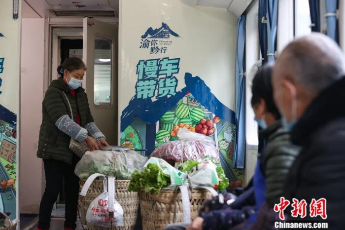 貴州桐梓,菜農(nóng)在5630次“慢火車”的“帶貨車廂”內整理蔬菜。往返于遵義市與重慶市的5629/30次公益性“慢火車”最低票價6元人民幣,是當?shù)卮迕癯鲂械闹匾煌üぞ?。瞿宏?攝