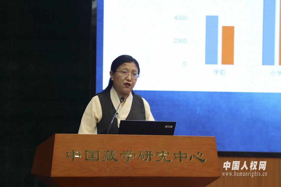 中國藏學(xué)研究中心社會(huì)經(jīng)濟(jì)研究所副所長、研究員格桑卓瑪在會(huì)上作題為《西藏現(xiàn)代教育堅(jiān)持教育公平,促進(jìn)了人的全面發(fā)展》的主旨發(fā)言。中國人權(quán)網(wǎng) 焦飛 攝