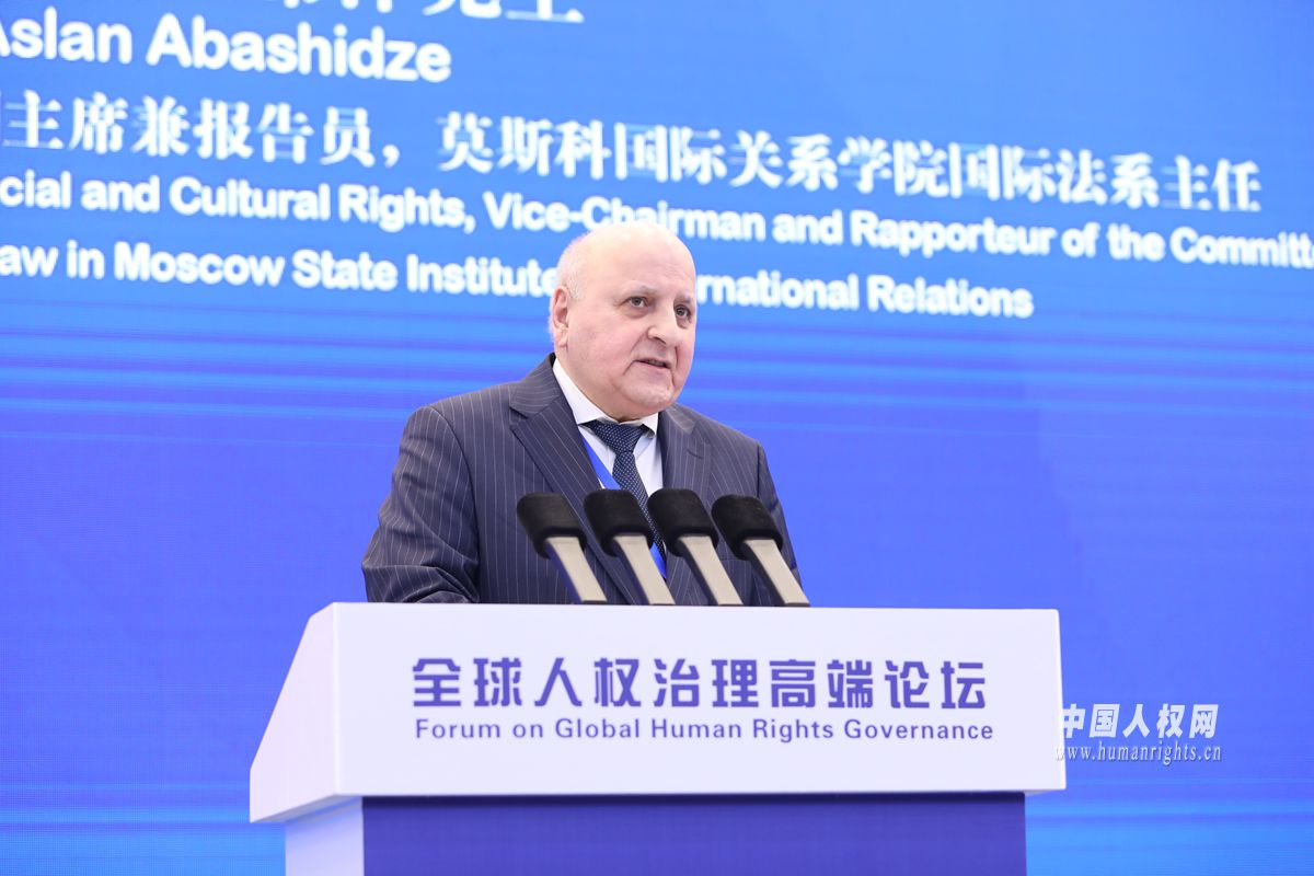 6月14日-15日,全球人權(quán)治理高端論壇在北京舉辦。圖為聯(lián)合國經(jīng)濟(jì)、社會及文化權(quán)利委員會副主席兼報(bào)告員,莫斯科國際關(guān)系學(xué)院國際法系主任阿斯蘭·阿巴希澤先生作大會發(fā)言。攝影:欒海軍