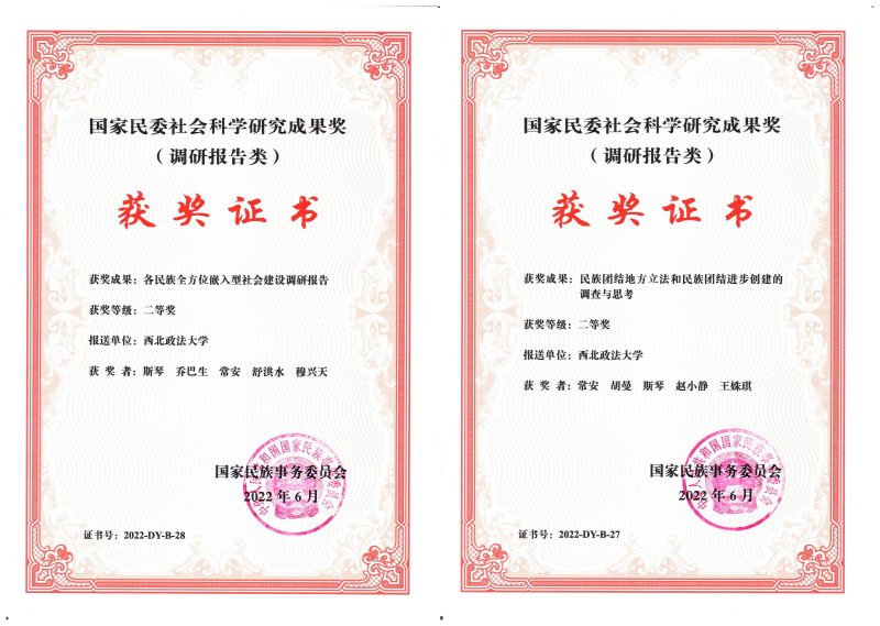 2022年6月,西北政法大學(xué)獲批兩項(xiàng)國(guó)家民委社會(huì)科學(xué)優(yōu)秀成果獎(jiǎng)(調(diào)研報(bào)告類)二等獎(jiǎng),包括人權(quán)研究中心執(zhí)行主任、法治與中華民族共同體建設(shè)研究中心主任常安教授牽頭、胡曼博士、斯琴博士、趙小靜博士、王姝琪參與的“民族團(tuán)結(jié)地方立法和民族團(tuán)結(jié)進(jìn)步創(chuàng)建的調(diào)查與思考”,和國(guó)家安全學(xué)院(反恐怖主義法學(xué)院)講師、法治與中華民族共同體建設(shè)研究中心研究人員斯琴博士牽頭、喬巴生博士、常安教授、舒洪水教授、穆興天教授參與的“各民族全方位嵌入型社會(huì)建設(shè)調(diào)研報(bào)告”。