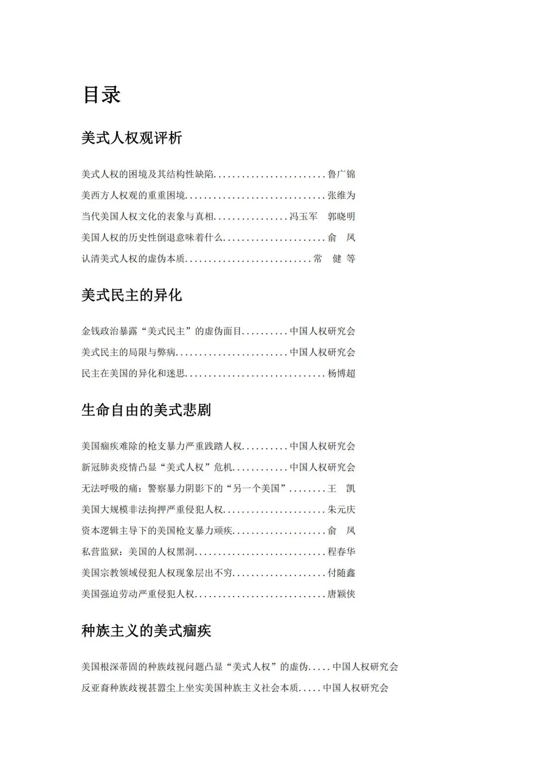 《美國(guó)人權(quán)的多維透視》一書(shū)從政治、司法制度,種族問(wèn)題、貧富分化、特殊群體權(quán)利、對(duì)外干涉和踐踏人權(quán)等不同角度揭示了美式人權(quán)的困境及其根深蒂固的結(jié)構(gòu)性問(wèn)題。該書(shū)集納了中國(guó)人權(quán)研究會(huì)有關(guān)美國(guó)人權(quán)問(wèn)題的系列專題報(bào)告和知名專家學(xué)者文章,并配有中央廣播電視總臺(tái)制作播出的相關(guān)紀(jì)錄片鏈接及二維碼。全書(shū)實(shí)事求是、論證充分、資料詳實(shí),對(duì)于系統(tǒng)研究、剖析美國(guó)人權(quán)問(wèn)題具有一定的借鑒意義。