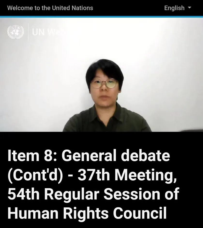 西南政法大學(xué)人權(quán)研究院“一帶一路國別人權(quán)狀況評估中心”主任廖予含在聯(lián)合國人權(quán)理事會第54屆會發(fā)言(圖源:西南政法大學(xué)人權(quán)研究院)