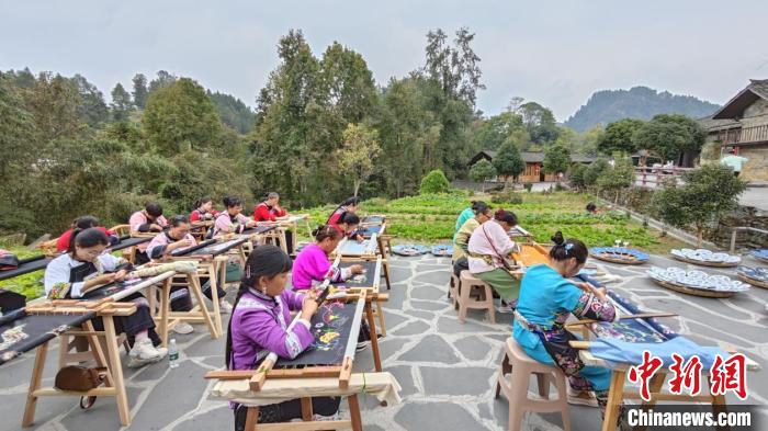 11月3日,繡娘們在十八洞村苗繡創(chuàng)作基地創(chuàng)作苗繡產(chǎn)品,苗繡已成為十八洞村的特色產(chǎn)業(yè)。中新網(wǎng)記者徐志雄攝
