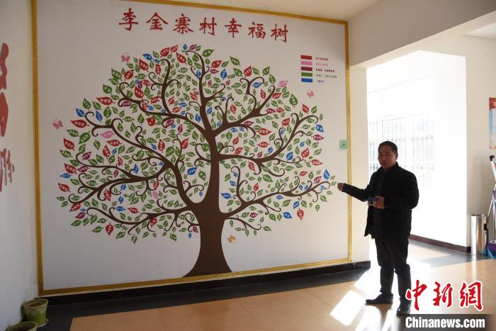 在李金寨村村委一面墻上,一棵高達(dá)3米的彩繪“幸福樹”引人注目。