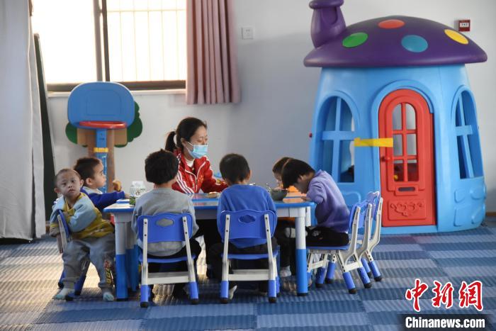 老師正在帶領(lǐng)孩子們吃飯。 王宇 攝