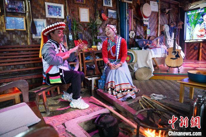 循著歌聲,記者走進村莊中心的小慧傳習館。丈夫江曉春懷抱怒族的四弦彈撥樂器達比亞,妻子張曉慧口銜傈僳族的短笛與口弦,琴瑟和諧,為遠道而來的游客表演《老姆登之夜》《怒蘇少年嘆》《怒族酒歌》等民族歌謠。