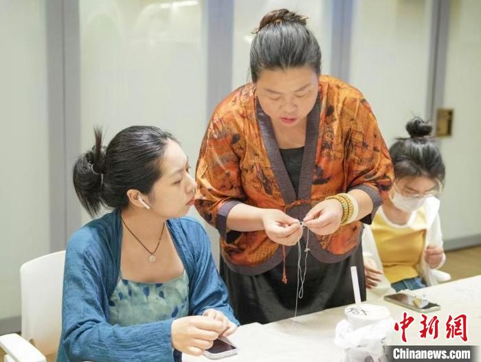 2023年8月,張閑閑(右)為來訪者教授刺繡技藝。(資料圖)受訪者供圖
