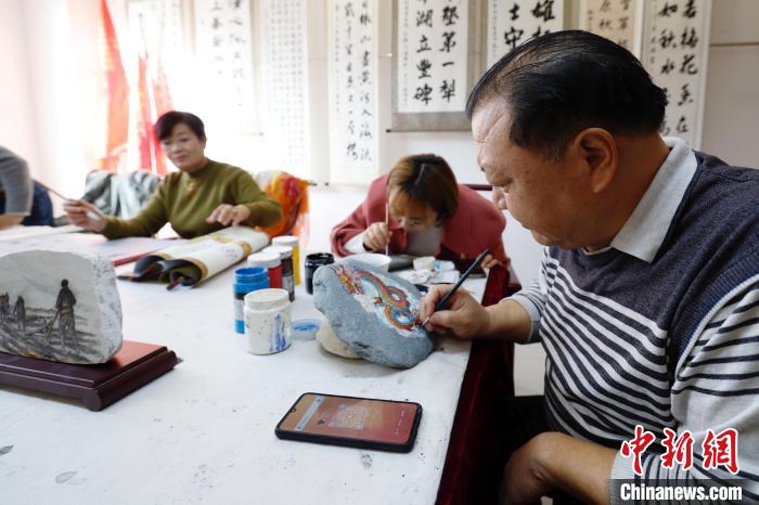 11日上午10點(diǎn)多,社區(qū)志愿者趙光海來(lái)到家門口的白楊社區(qū)黨群心連心服務(wù)中心,與幾位社區(qū)居民一起練習(xí)書畫。退休前從事工藝美術(shù)行業(yè)的他是大家的老師,尤其受到社區(qū)內(nèi)老年人的歡迎,最近,大家正一起創(chuàng)作石頭畫。