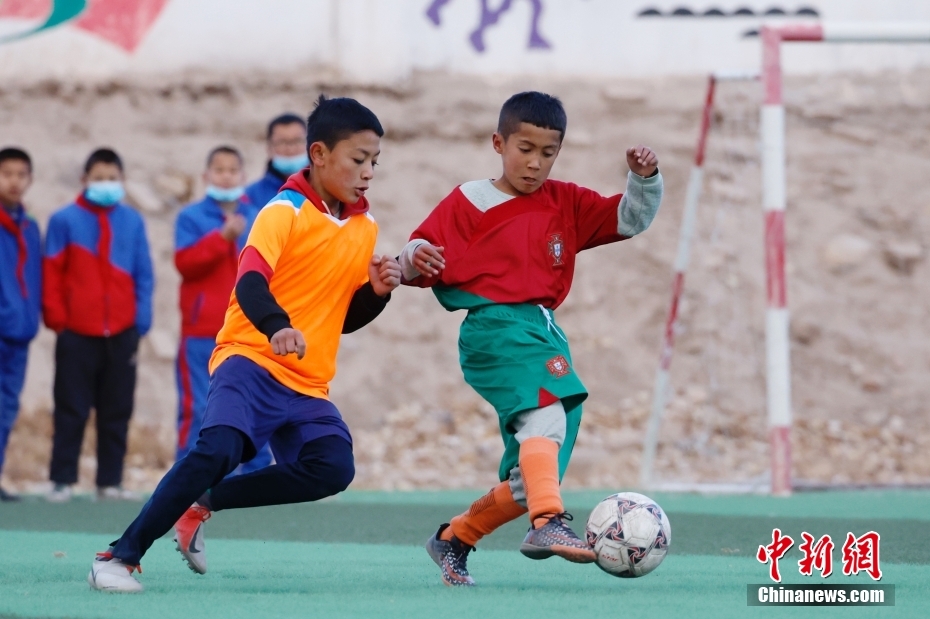 新疆很多人喜愛足球。在新疆阿圖什,人們更是驕傲于當(dāng)?shù)貪夂竦淖闱蚍諊土己玫娜罕娀A(chǔ)。13日,中新社記者來到阿圖什市上阿圖什鎮(zhèn)依克薩克小學(xué),一場鄉(xiāng)村小學(xué)間的足球賽正激烈進(jìn)行。圖為比拉力·阿布都克熱木(右一)在比賽中帶球。中新社記者 韓海丹 攝