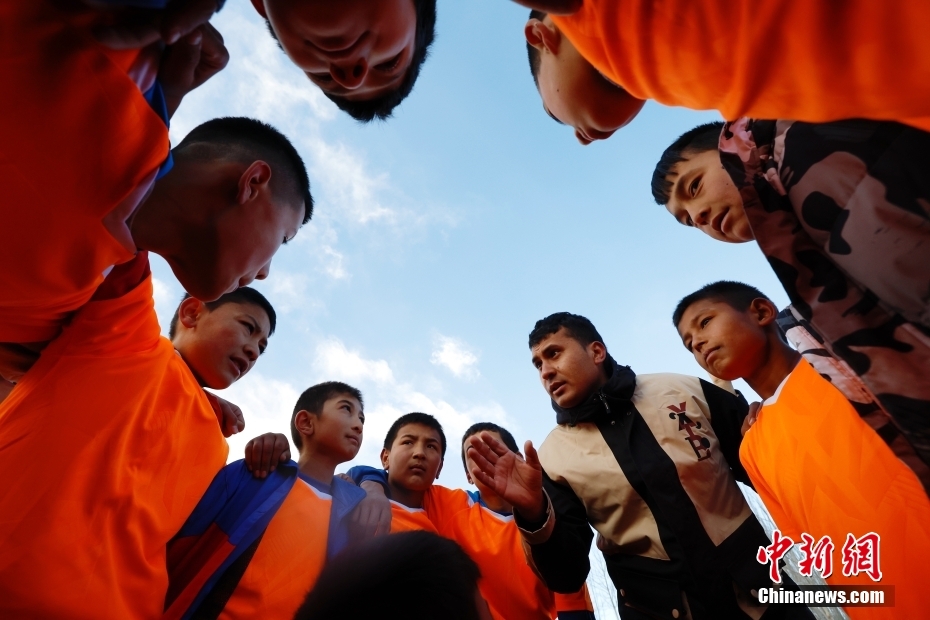 新疆很多人喜愛足球。在新疆阿圖什,人們更是驕傲于當(dāng)?shù)貪夂竦淖闱蚍諊土己玫娜罕娀A(chǔ)。13日,中新社記者來到阿圖什市上阿圖什鎮(zhèn)依克薩克小學(xué),一場鄉(xiāng)村小學(xué)間的足球賽正激烈進(jìn)行。圖為足球隊(duì)教練玉山江·艾買提指導(dǎo)球員戰(zhàn)術(shù)。中新社記者 韓海丹 攝