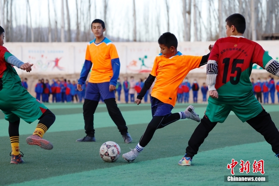 新疆很多人喜愛足球。在新疆阿圖什,人們更是驕傲于當(dāng)?shù)貪夂竦淖闱蚍諊土己玫娜罕娀A(chǔ)。13日,中新社記者來到阿圖什市上阿圖什鎮(zhèn)依克薩克小學(xué),一場鄉(xiāng)村小學(xué)間的足球賽正激烈進(jìn)行。中新社記者 韓海丹 攝