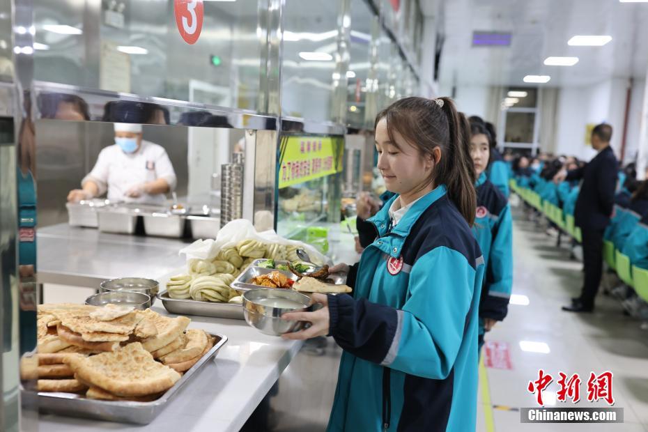 12月13日,新疆維吾爾自治區(qū)哈密市豫哈實(shí)驗(yàn)學(xué)校,學(xué)生們在食堂就餐。中新社記者 楊可佳 攝