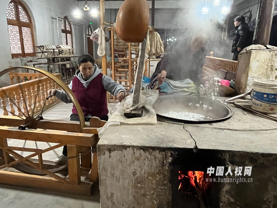 工人正在現(xiàn)場展示傳統(tǒng)手工抽絲工藝。