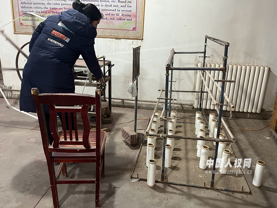 工人正在進行捆絲,將合并好的絲線按照傳統(tǒng)的花色圖案排列。