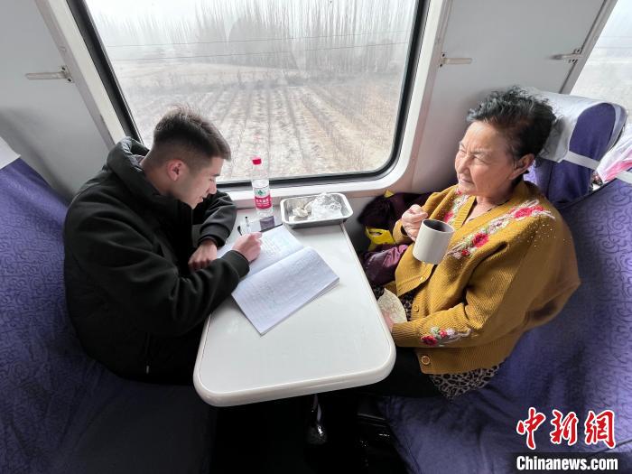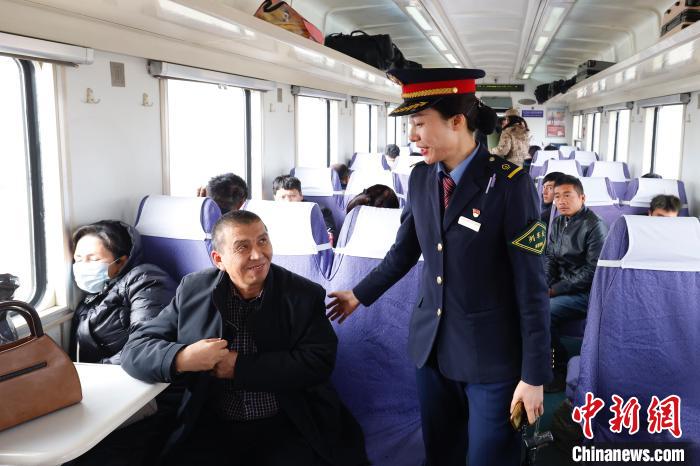 12月14日,和田至喀什的T9531次列車上,列車長王繼雯正在與乘客交流。中新社記者 韓海丹 攝