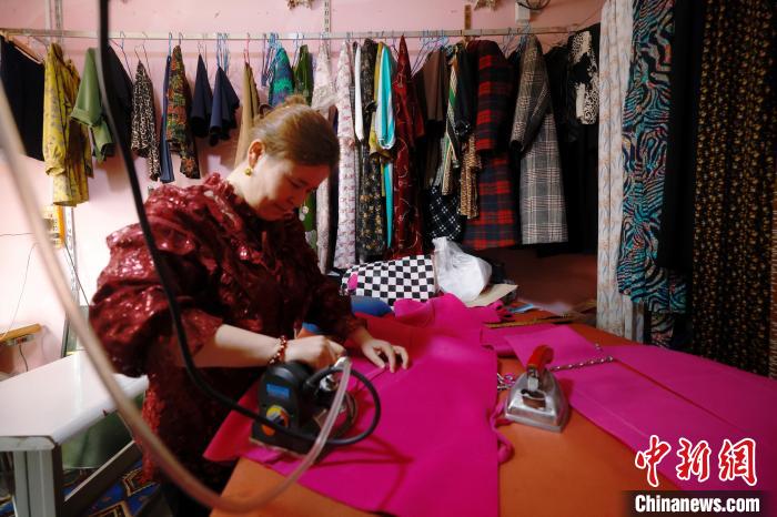 和田地區(qū)皮山農(nóng)場(chǎng)的一間裁縫店內(nèi),店主布阿米乃·賽迪艾合買提正在忙碌。中新社記者 韓海丹 攝