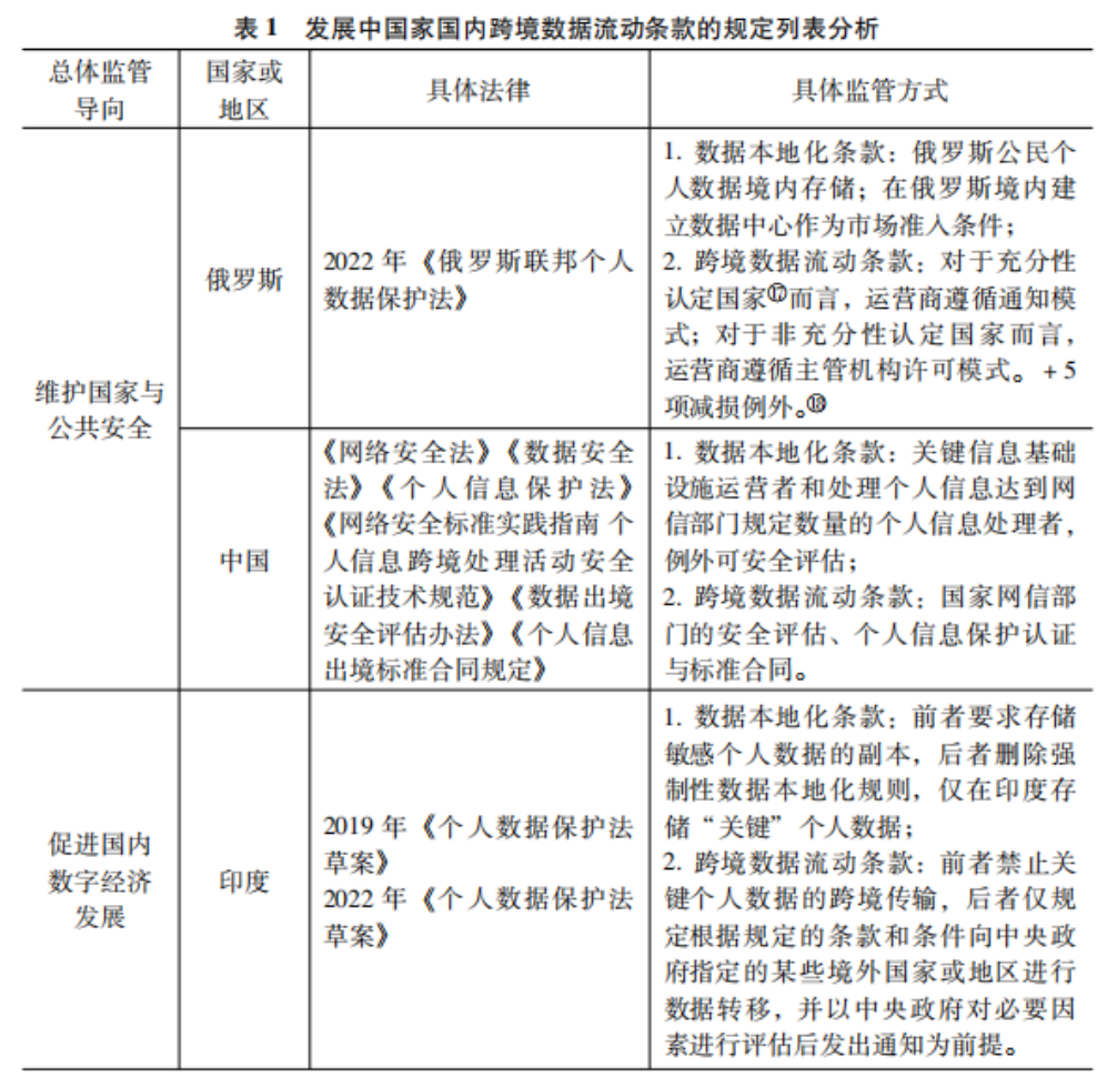 表1  發(fā)展中國家國內(nèi)跨境數(shù)據(jù)流動條款的規(guī)定列表分析