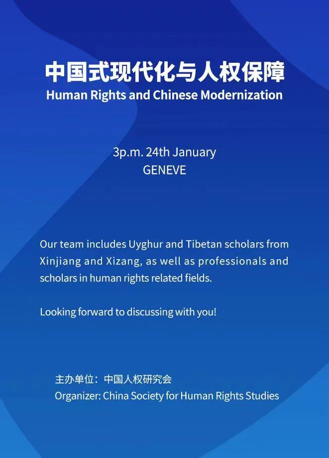 參加審議期間,中國人權研究會將于北京時間1月24日22:00(日內瓦時間:1月24日15:00)在日內瓦舉辦“中國式現代化與人權保障”主題邊會,來自中國新疆和中國西藏的維吾爾族、藏族學者,以及人權相關領域的多位專家學者參會并發(fā)表精彩觀點。